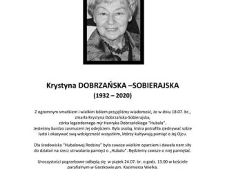 Opublikowano: wtorek, 21, lipiec 2020 06:03 Z ogromnym smutkiem i wielkim bólem przyjęliśmy wiadomość, że w dniu 18.07. br. w godzinach rannych, zmarła Krystyna Dobrzańska-Sobierajska, córka legendarnego mjr Henryka Dobrzańskiego “Hubala”. Jesteśmy bardzo zasmuceni Jej […]